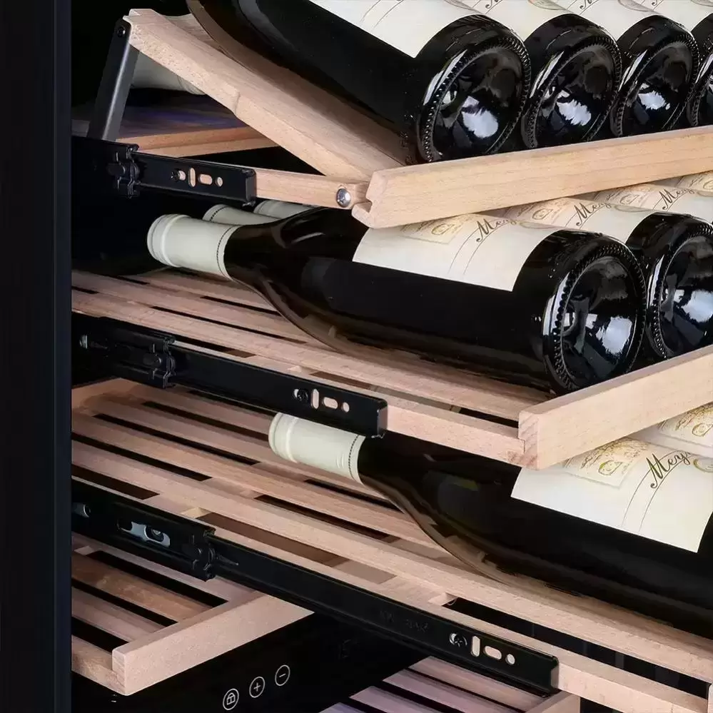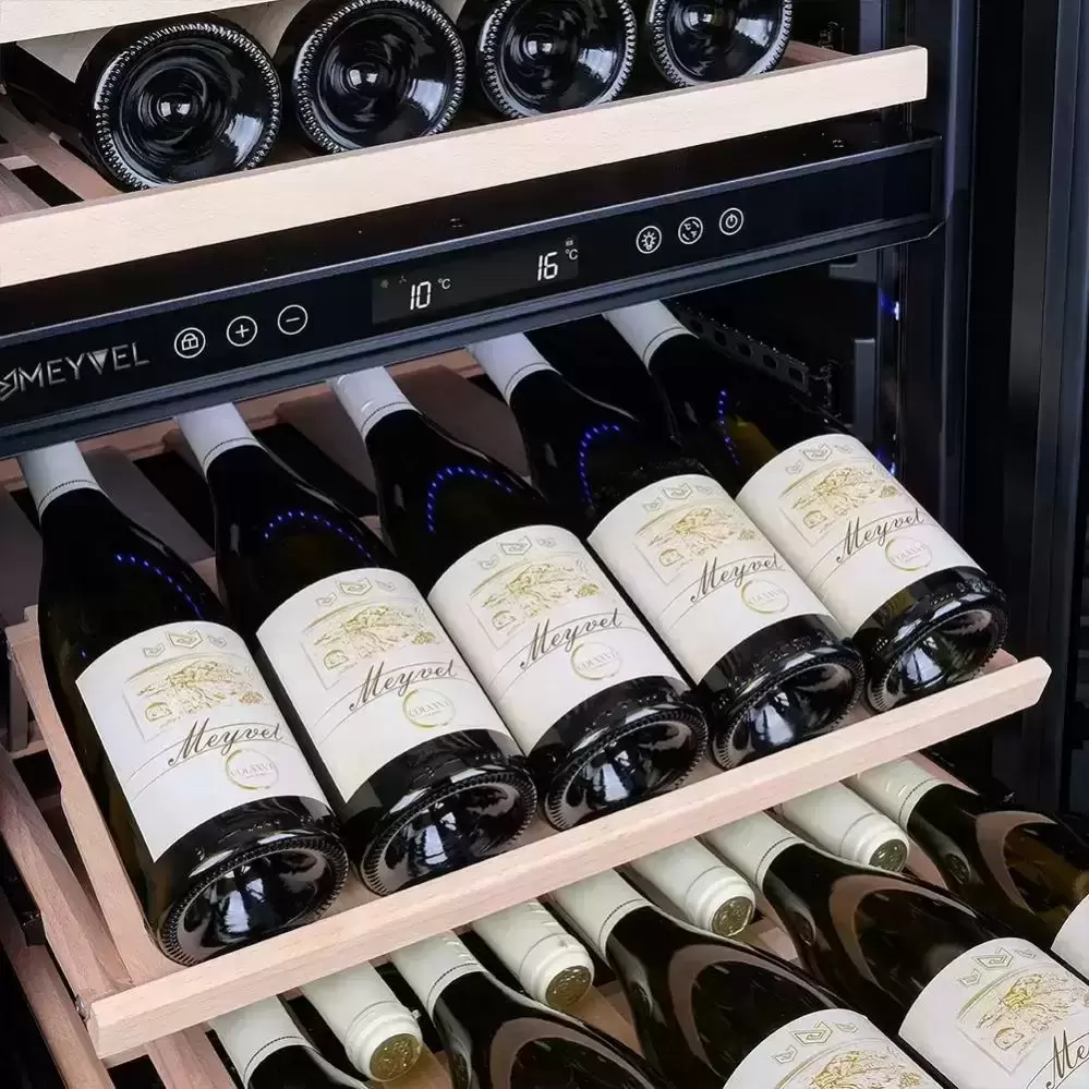 Винный холодильник Meyvel MV154PRO-KBT3 имеет несколько температурных зон, в которых одновременно можно хранить разные сорта алкоголя и выставлять разные сочетания настроек. Он встраивается в нишу, что удобно, если у вас ограничен метраж помещения. Количество бутылок, которое можно разместить с учетом полной комплектации и из расчета объема бутылки 0,75 л, — 154 шт.